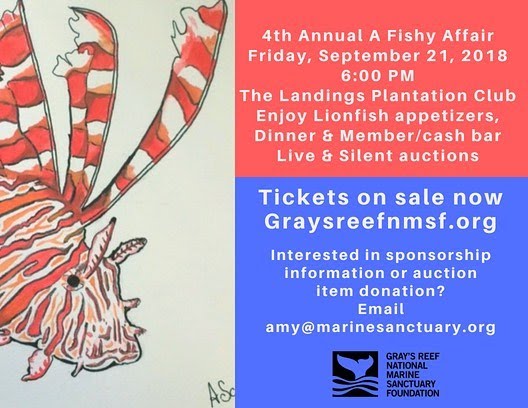 4th Annual A Fishy Affair: Malicious...but Delicious! Tickets on sale now! Click here to purchase tickets and tables! Gray's Reef National Marine Sanctuary Foundation hosts the 4th Annual 'A Fishy Affair: Malicious...but Delicious' on Friday, September 21 at The Landings Plantation Club. The lionfish chef's challenge features incredible chefs preparing their own unique lionfish dish followed by a full dinner. Over 250 diners will enjoy 350 pounds of lionfish to help continue the movement for restaurants to serve lionfish and for the community to support Gray's Reef. A raffle, live auction, short lionfish film, lionfish cake, and signature cocktail will be featured at the entertaining and educational evening that benefit Gray's Reef National Marine Sanctuary Foundation. Thank you for your support! Chef Lineup for 2018: Sam Brod, The Landings Coub Tony Seichrist, The Wyld Dock Bar Jin Kang, The Landings Club |